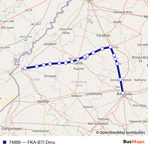 The first stop of the 74988 rail route is Fazilka and the last stop is Bathinda. 74988 (FKA-BTI Dmu) is operational during everyday.