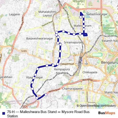 The first stop of the 75-H bus route is Mysore Road Bus Station and the last stop is Malleshwara Bus Stand. 75-H (Malleshwara Bus Stand ⇔ Mysore Road Bus Station) is operational during everyday.