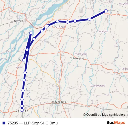The first stop of the 75205 rail route is Lalitgram and the last stop is Saharsa Jn. 75205 (LLP-Srgr-SHC Dmu) is operational during everyday.