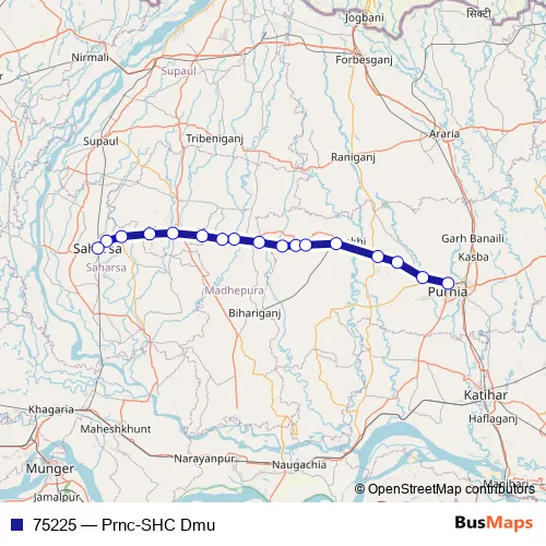 The first stop of the 75225 rail route is Purnia Court and the last stop is Saharsa Jn. 75225 (Prnc-SHC Dmu) is operational during everyday.