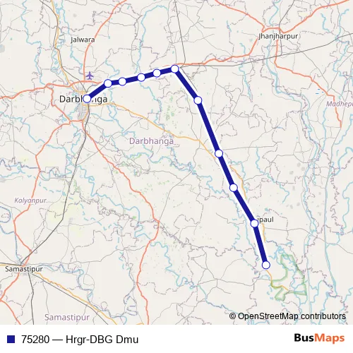 The first stop of the 75280 rail route is Harnagar and the last stop is Darbhanga Jn. 75280 (Hrgr-DBG Dmu) is operational during everyday.