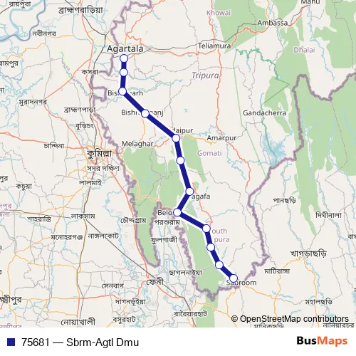 The first stop of the 75681 rail route is Sabroom and the last stop is Agartala. 75681 (Sbrm-Agtl Dmu) is operational during everyday.