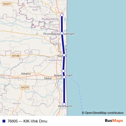 The first stop of the 76805 rail route is Karaikal and the last stop is Vellankanni. 76805 (KIK-Vlnk Dmu) is operational during everyday.
