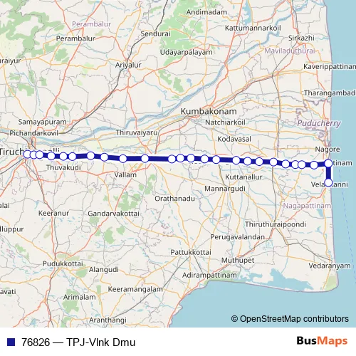 The first stop of the 76826 rail route is Tiruchchirappalli Jn. and the last stop is Vellankanni. 76826 (TPJ-Vlnk Dmu) is operational during everyday.