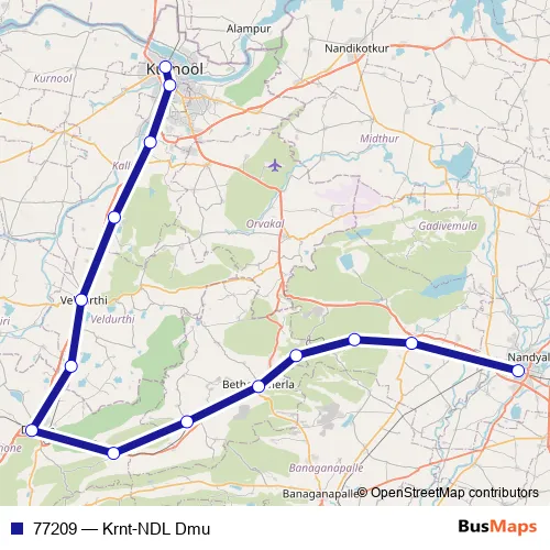 The first stop of the 77209 rail route is Kurnool City and the last stop is Nandyal. 77209 (Krnt-NDL Dmu) is operational during everyday.