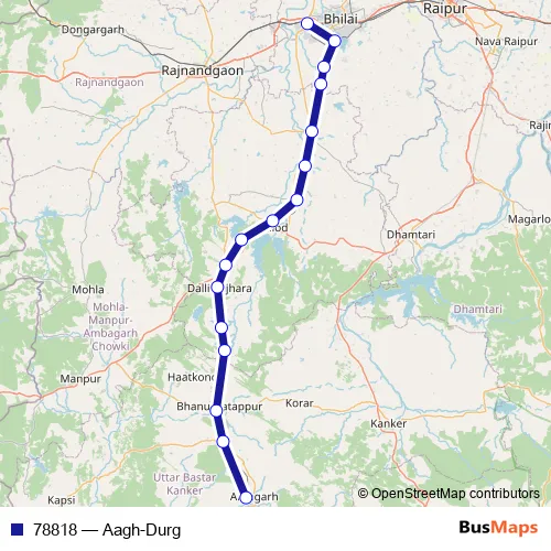 The first stop of the 78818 rail route is Antagarh and the last stop is Durg. 78818 (Aagh-Durg) is operational during everyday.