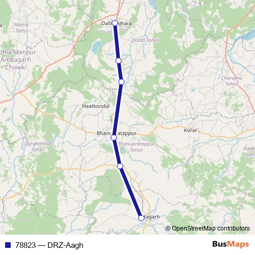 The first stop of the 78823 rail route is Dalli Rajhara and the last stop is Antagarh. 78823 (DRZ-Aagh) is operational during everyday.