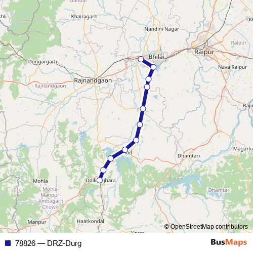 The first stop of the 78826 rail route is Dalli Rajhara and the last stop is Durg. 78826 (DRZ-Durg) is operational during everyday.