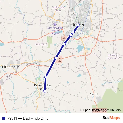 The first stop of the 79311 rail route is DR. Ambedkar Nagar and the last stop is Indore Jn. 79311 (Dadn-Indb Dmu) is operational during everyday.