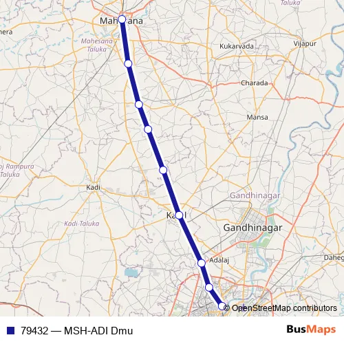 The first stop of the 79432 rail route is Mahesana Jn and the last stop is Sabarmati Bg. 79432 (MSH-ADI Dmu) is operational during everyday.