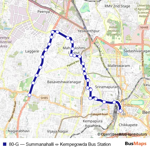 The first stop of the 80-G bus route is Kempegowda Bus Station and the last stop is Summanahalli. 80-G (Summanahalli ⇔ Kempegowda Bus Station) is operational during everyday.