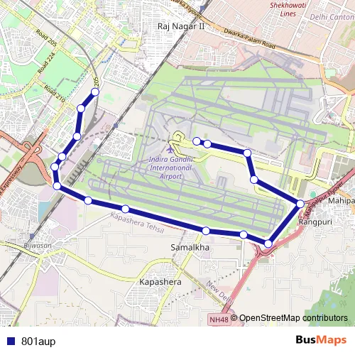 The first stop of the 801aup bus route is Dwarka Sec-8 Metro Station and the last stop is IGI Airport Terminal 2 (Air India Office). 801aup is operational during everyday.