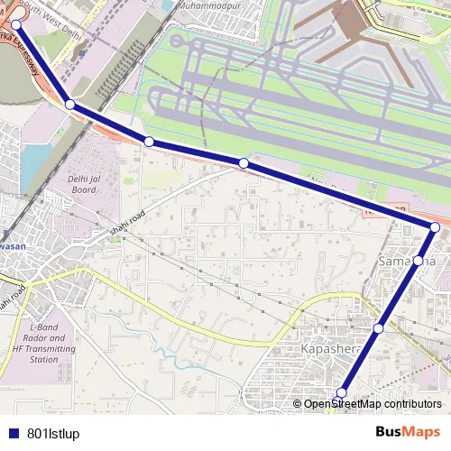 The first stop of the 801lstlup bus route is Dwarka Sec 22 Cluster Depot and the last stop is Kapashera Border. 801lstlup is operational during everyday.