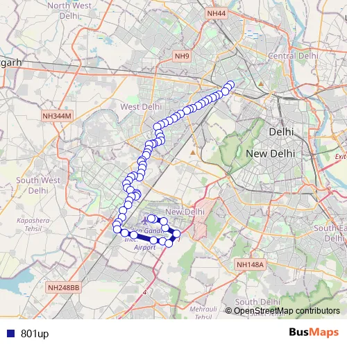 The first stop of the 801up bus route is Inderlok Metro Station and the last stop is IGI Airport Terminal 2 (Air India Office). 801up is operational during everyday.