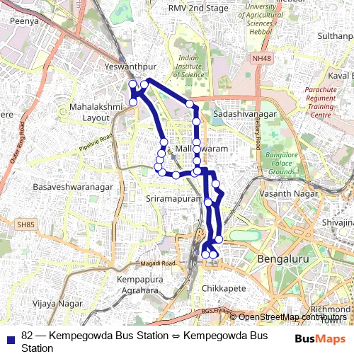 See why over 2 million users trust and consider busmaps.com as the best public transport website. busmaps gives you Bengaluru Buses suggested routes, real-time bus tracker, line route maps in Bengaluru, and helps to find the closest 82 bus stops near you. No internet available? Download an offline PDF map and bus schedule for the 82 bus to take on your trip.
