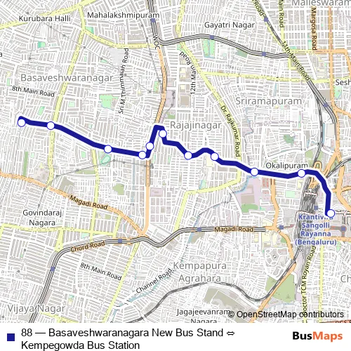 The first stop of the 88 bus route is Kempegowda Bus Station and the last stop is Basaveshwaranagara New Bus Stand. 88 (Basaveshwaranagara New Bus Stand ⇔ Kempegowda Bus Station) is operational during everyday.