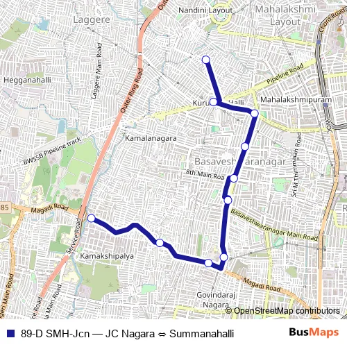The first stop of the 89-D SMH-Jcn bus route is Summanahalli and the last stop is JC Nagara Kurubarahalli. 89-D SMH-Jcn (JC Nagara ⇔ Summanahalli) is operational during everyday.