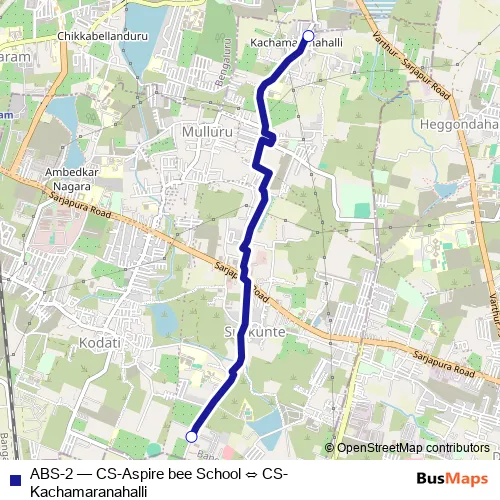 The first stop of the ABS-2 bus route is CS-Kachamaranahalli and the last stop is CS-Aspire bee School. ABS-2 (CS-Aspire bee School ⇔ CS-Kachamaranahalli) is operational during everyday.