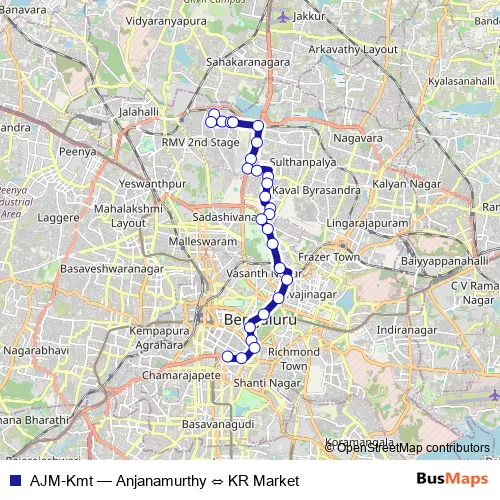 The first stop of the AJM-Kmt bus route is Anjanamurthy and the last stop is KR Market. AJM-Kmt (Anjanamurthy ⇔ KR Market) is operational during everyday.