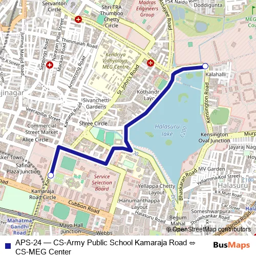 The first stop of the APS-24 bus route is CS-MEG Center and the last stop is CS-Army Public School Kamaraja Road. APS-24 (CS-Army Public School Kamaraja Road ⇔ CS-MEG Center) is operational during everyday.