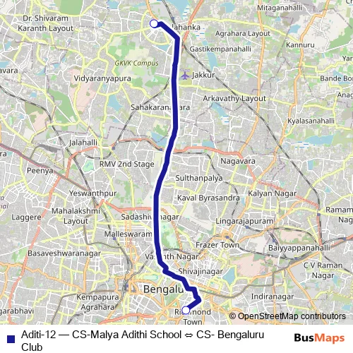 The first stop of the Aditi-12 bus route is CS- Bengaluru Club and the last stop is CS-Malya Adithi School. Aditi-12 (CS-Malya Adithi School ⇔ CS- Bengaluru Club) is operational during everyday.