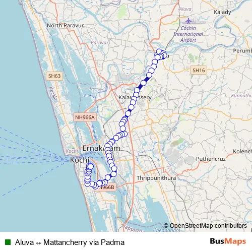 See why over 2 million users trust and consider busmaps.com as the best public transport website. busmaps gives you Kochi Buses suggested routes, real-time bus tracker, line route maps in Kochi, and helps to find the closest Aluva ↔ Mattancherry via Padma bus stops near you. No internet available? Download an offline PDF map and bus schedule for the Aluva ↔ Mattancherry via Padma bus to take on your trip.