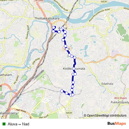 The first stop of the Aluva ↔ Nad bus route is NAD Signal and the last stop is Aluva. Aluva ↔ Nad is operational during everyday.