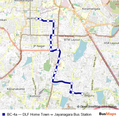 The first stop of the BC-4a bus route is DLF Home Town and the last stop is Jayanagara Bus Station. BC-4a (DLF Home Town ⇔ Jayanagara Bus Station) is operational during everyday.