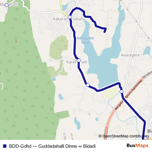 The first stop of the BDD-Gdhd bus route is Guddadahalli Dinne and the last stop is Bidadi. BDD-Gdhd (Guddadahalli Dinne ⇔ Bidadi) is operational during everyday.