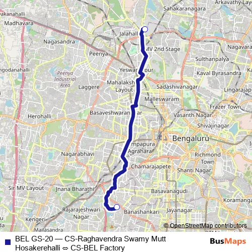 The first stop of the BEL GS-20 bus route is CS-BEL Factory and the last stop is CS-Raghavendra Swamy Mutt Hosakerehalli. BEL GS-20 (CS-Raghavendra Swamy Mutt Hosakerehalli ⇔ CS-BEL Factory) is operational during everyday.