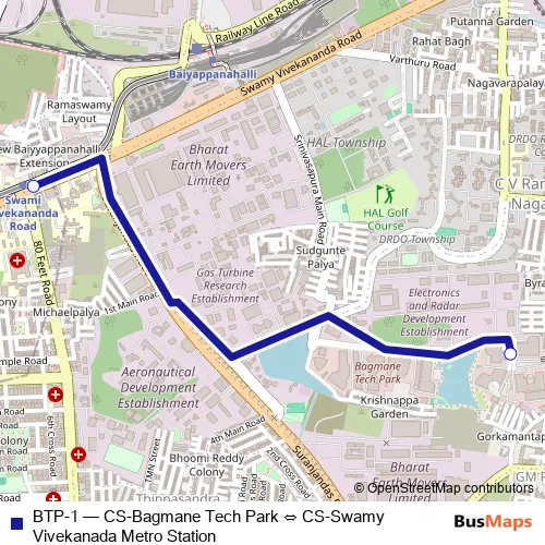The first stop of the BTP-1 bus route is CS-Swamy Vivekanada Metro Station and the last stop is CS-Bagmane Tech Park. BTP-1 (CS-Bagmane Tech Park ⇔ CS-Swamy Vivekanada Metro Station) is operational during everyday.