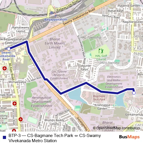 The first stop of the BTP-3 bus route is CS-Swamy Vivekanada Metro Station and the last stop is CS-Bagmane Tech Park. BTP-3 (CS-Bagmane Tech Park ⇔ CS-Swamy Vivekanada Metro Station) is operational during everyday.