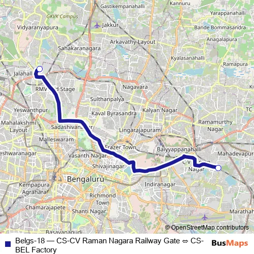 The first stop of the Belgs-18 bus route is CS-CV Raman Nagara Railway Gate and the last stop is CS-BEL Factory. Belgs-18 (CS-CV Raman Nagara Railway Gate ⇔ CS-BEL Factory) is operational during everyday.