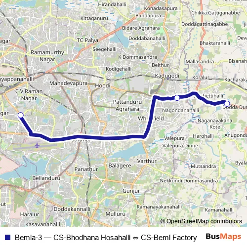 The first stop of the Bemla-3 bus route is CS-Beml Factory and the last stop is CS-Bhodhana Hosahalli. Bemla-3 (CS-Bhodhana Hosahalli ⇔ CS-Beml Factory) is operational during everyday.