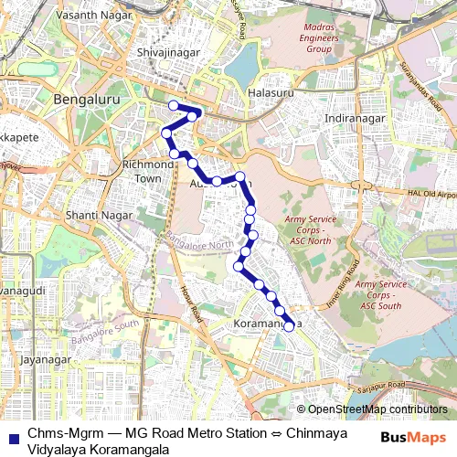 Click here to view the nearest Chms-Mgrm - MG Road Metro Station ⇔ Chinmaya Vidyalaya Koramangala bus stop.