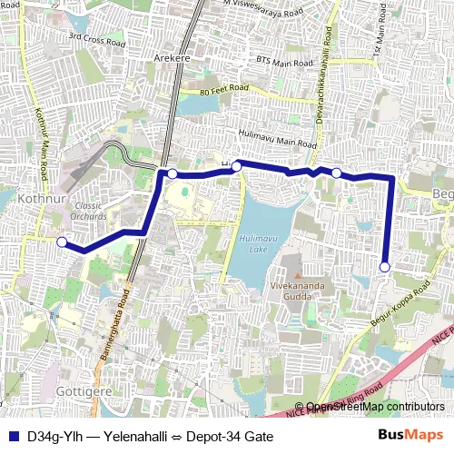 The first stop of the D34g-Ylh bus route is Depot-34 Gate and the last stop is Yelenahalli. D34g-Ylh (Yelenahalli ⇔ Depot-34 Gate) is operational during everyday.