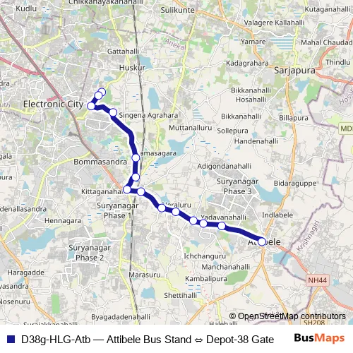 The first stop of the D38g-HLG-Atb bus route is Depot-38 Gate and the last stop is Attibele Bus Stand. D38g-HLG-Atb (Attibele Bus Stand ⇔ Depot-38 Gate) is operational during everyday.