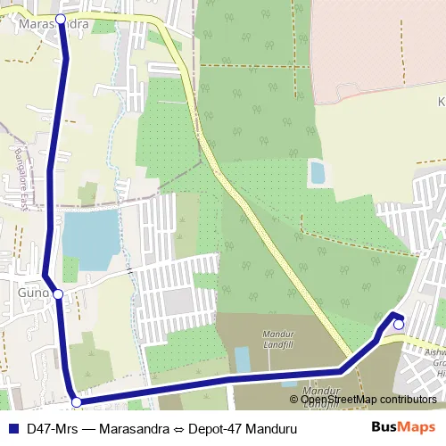 The first stop of the D47-Mrs bus route is Marasandra and the last stop is Depot-47 Manduru. D47-Mrs (Marasandra ⇔ Depot-47 Manduru) is operational during everyday.