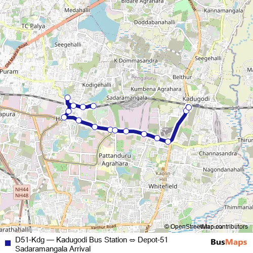 The first stop of the D51-Kdg bus route is Depot-51 Sadaramangala Departure and the last stop is Kadugodi Bus Station. D51-Kdg (Kadugodi Bus Station ⇔ Depot-51 Sadaramangala Arrival) is operational during everyday.