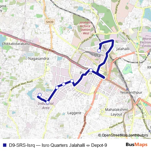 The first stop of the D9-SRS-Isrq bus route is Isro Quarters Jalahalli and the last stop is Depot-9. D9-SRS-Isrq (Isro Quarters Jalahalli ⇔ Depot-9) is operational during everyday.