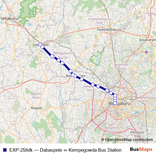 The first stop of the EXP-258dk bus route is Kempegowda Bus Station and the last stop is Dabaspete. EXP-258dk (Dabaspete ⇔ Kempegowda Bus Station) is operational during everyday.