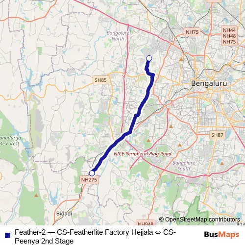 The first stop of the Feather-2 bus route is CS-Peenya 2nd Stage and the last stop is CS-Featherlite Factory Hejjala. Feather-2 (CS-Featherlite Factory Hejjala ⇔ CS-Peenya 2nd Stage) is operational during everyday.