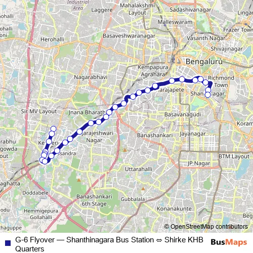 The first stop of the G-6 Flyover bus route is Shirke KHB Quarters and the last stop is Shanthinagara Bus Station. G-6 Flyover (Shanthinagara Bus Station ⇔ Shirke KHB Quarters) is operational during everyday.
