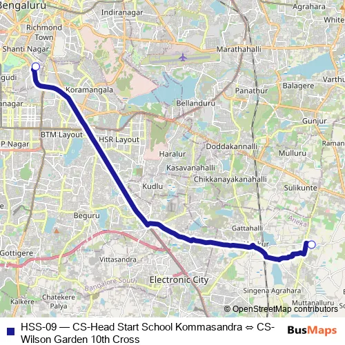 The first stop of the HSS-09 bus route is CS-Wilson Garden 10th Cross and the last stop is CS-Head Start School Kommasandra. HSS-09 (CS-Head Start School Kommasandra ⇔ CS-Wilson Garden 10th Cross) is operational during everyday.