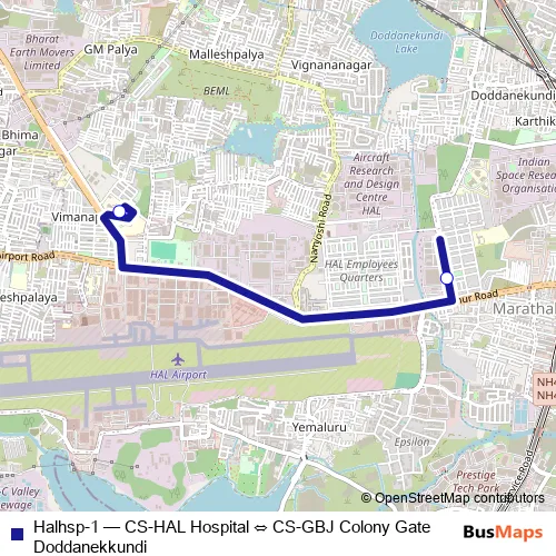 The first stop of the Halhsp-1 bus route is CS-GBJ Colony Gate Doddanekkundi and the last stop is CS-HAL Hospital. Halhsp-1 (CS-HAL Hospital ⇔ CS-GBJ Colony Gate Doddanekkundi) is operational during everyday.
