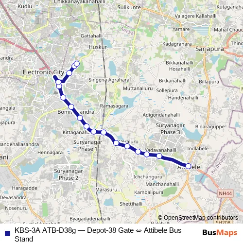 The first stop of the KBS-3A ATB-D38g bus route is Attibele Bus Stand and the last stop is