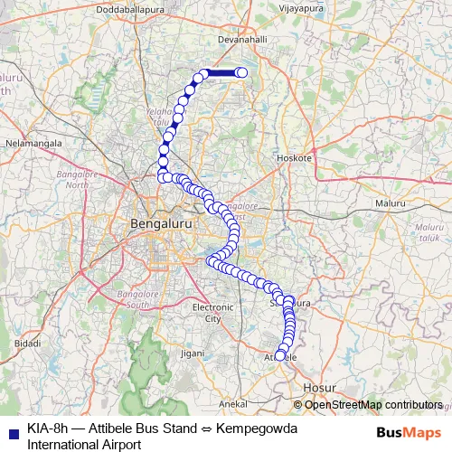 The first stop of the KIA-8h bus route is Kempegowda International Airport and the last stop is Attibele Bus Stand. KIA-8h (Attibele Bus Stand ⇔ Kempegowda International Airport) is operational during everyday.