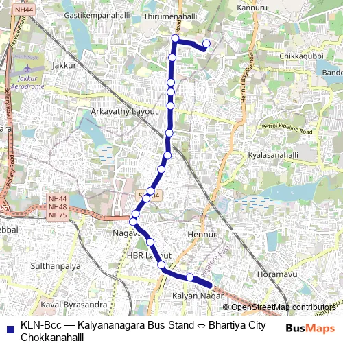 The first stop of the KLN-Bcc bus route is Kalyananagara Bus Stand and the last stop is Bhartiya City Chokkanahalli. KLN-Bcc (Kalyananagara Bus Stand ⇔ Bhartiya City Chokkanahalli) is operational during everyday.