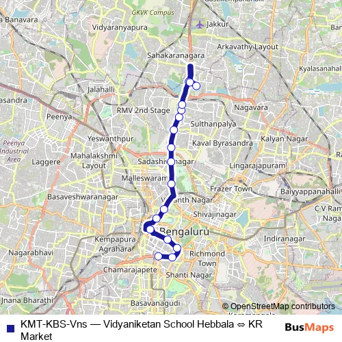 The first stop of the KMT-KBS-Vns bus route is KR Market and the last stop is Vidyaniketan School Hebbala. KMT-KBS-Vns (Vidyaniketan School Hebbala ⇔ KR Market) is operational during everyday.