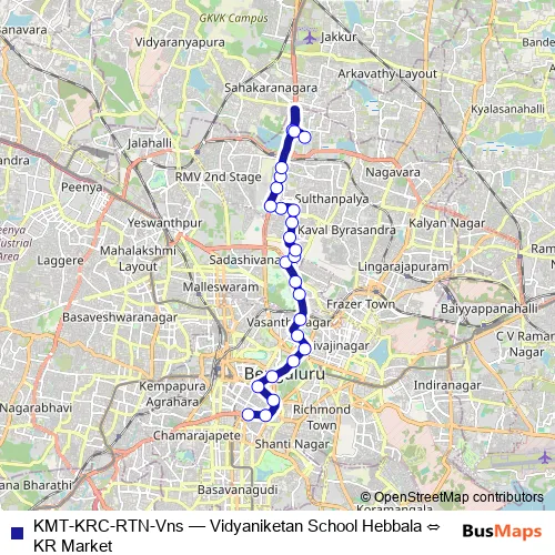 The first stop of the KMT-KRC-RTN-Vns bus route is KR Market and the last stop is Vidyaniketan School Hebbala. KMT-KRC-RTN-Vns (Vidyaniketan School Hebbala ⇔ KR Market) is operational during everyday.